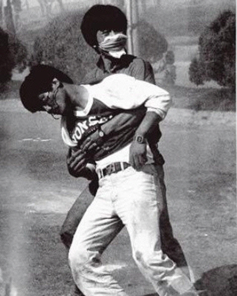 당시 언론에 보도된 최루탄을 맞고 피를 흘리며 실려가는 장면은